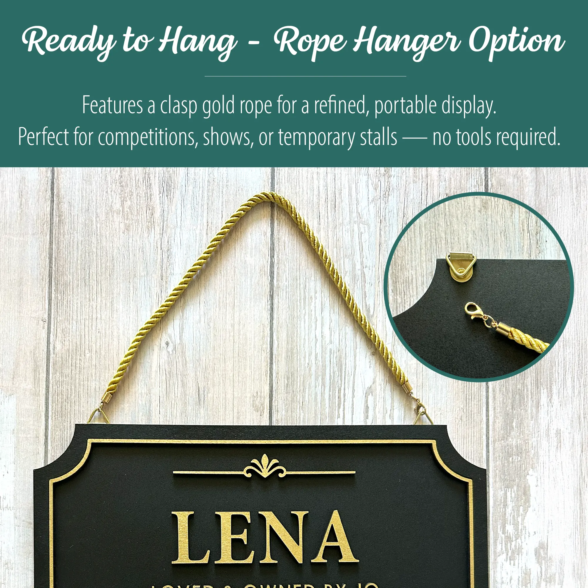 - Or choose the Rope Hanger for a refined, portable option that adds a touch of elegance — ideal for shows, competitions, or temporary stalls. (Gold rope with gold lettering, black rope with white lettering).