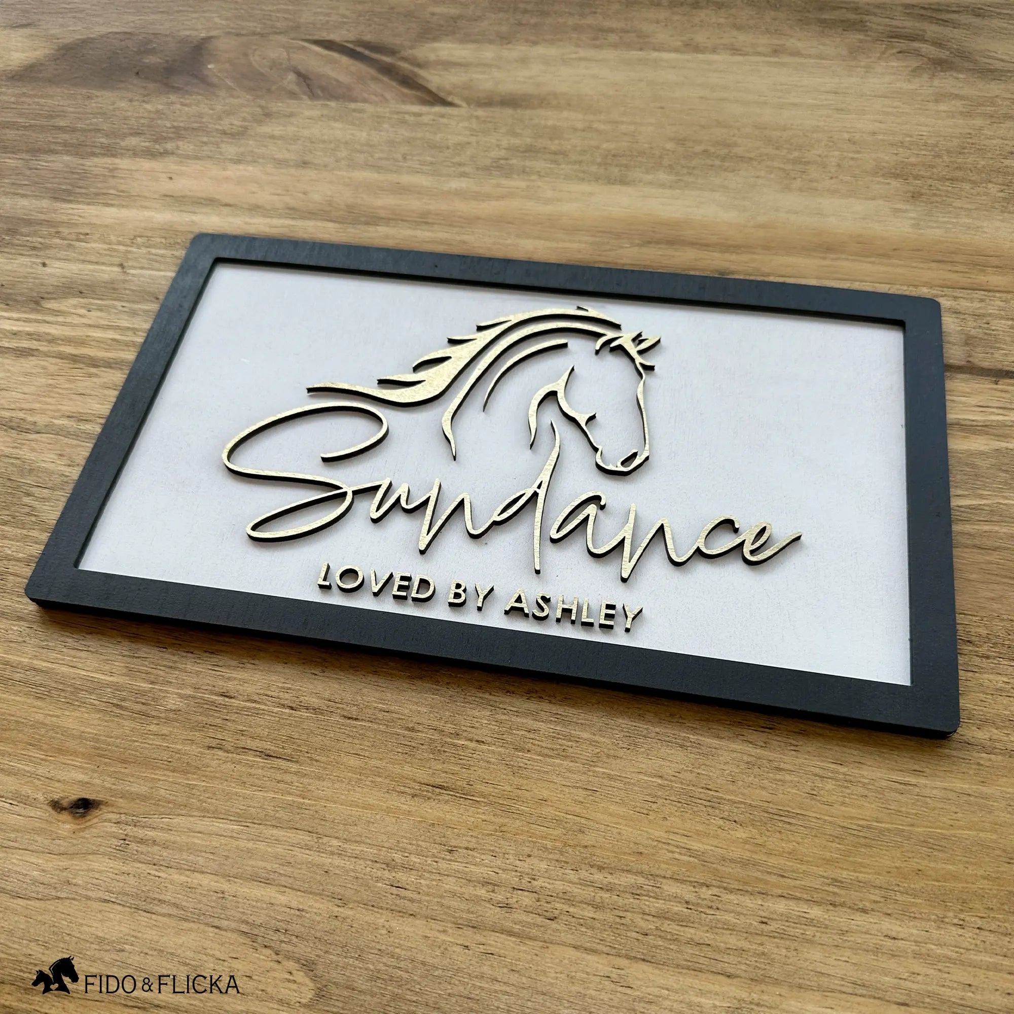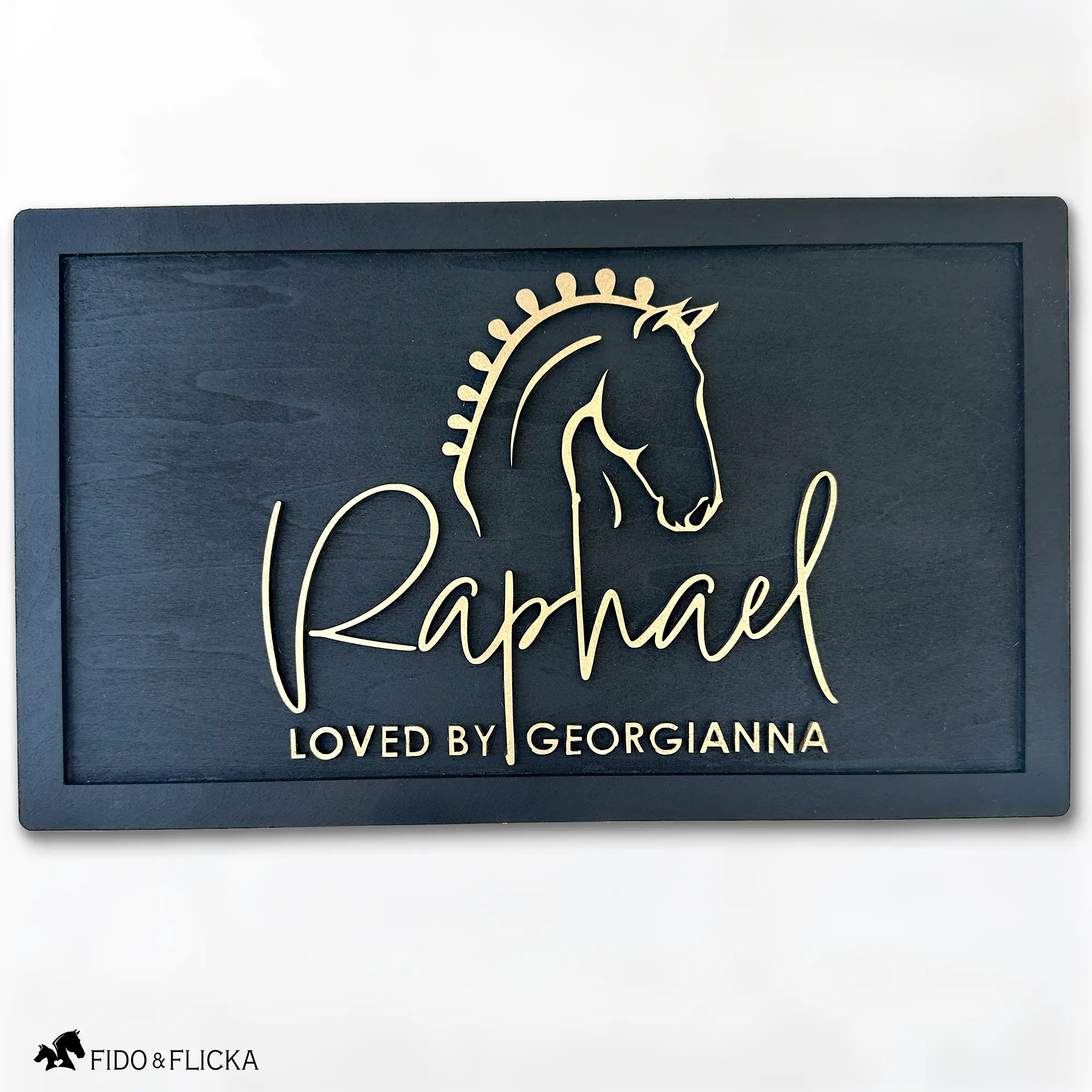 Each piece is crafted by hand with care, using premium materials and a meticulous process to ensure beauty and longevity. The result is a nameplate that feels personal, polished, and enduring — a small work of art that honors your horse’s legacy.